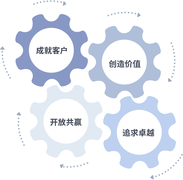 成就客户是一切决策的出发点,,,创造价值是衡量所有工作的标准,,追求卓越是我们做事做人的态度,,开放共赢是我们的格局也是最终的结果。。价值观的齿轮环环相扣,,推动着组织里的每个人不断向前。。